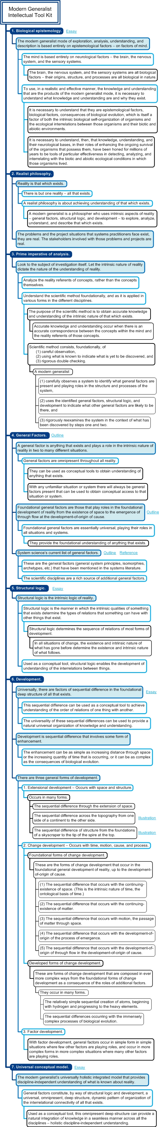 It is a second role of the connecting lines that makes the graphic outline not just hierarchic, but also dendritic. The graphic outline format, with its dendritic pattern, makes the overview accessible. These graphic outlines are designed to be used on a computer—the larger the screen the better. Each graphic outline is created as a single vertical image, and it is possible to scroll up and down to see any part not showing on the monitor. They are best viewed on a monitor that can be turned to a vertical or portrait position. The reason it is best to view them on a large vertical screen is to allow a view of the entire graphic outline. This gives the overview or holistic view that provides as much information as possible as simultaneously as possible. It enables the eyes to quickly roam over the entire chart relating various parts one with another. You see the big picture and the details simultaneously. There are Outline links that connect to additional graphic outlines, resulting in multiple pathways of investigation into deeper levels of details. These pathways of Outline links also have a dendritic organization of connections, similar to that of graphic outlines themselves. There are also Reference, Essay, and Illustration links connecting to supplementary material (Vesterby, 2008a). Figure 1. Modern generalist intellectual tool kit graphic outline.