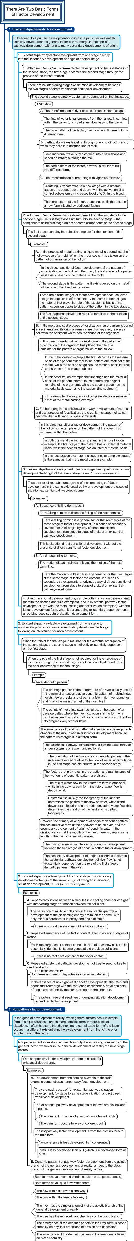 Figure 2. There are two basic forms of factor development. Benefits The modern generalist mode can be used to understand systems in any discipline. It enhances the ability to identify general patterns at various levels and in different disciplines through understanding the deep-structure of such patterns. With factor development, general factors occur in simple form in simple situations, and in more complex forms in more complex situations. No matter how complicated a developed form may be, the pattern of organization of the basic form is still there, giving the developed form its identity as a case of that particular general factor. Thus, understanding the basic pattern enhances recognition of more complex forms at whatever level they may occur or in whatever discipline. Searching out higher level developed forms of simpler general factors instills the habit of mind to see things and relations as patterns of organization. The mind soon begins to notice the patterns of organization of general factors as common features of systems in various disciplines and at multiple levels. The generalist way of looking at things displays the interconnectedness between and within all the levels through the use of the general factors that play roles of connectivity between and within the subjects studied by the various disciplines. Everything that exists is connected to something else that exists. Through continuing-existence that which has gone before is connected to that which follows. Through emergence higher levels develop from the interrelations of lower levels. Material structure emerges by way of contact and coherence. Process emerges by way of motion and cause. These pathways of connection through space and structure, through time and process, provide pathways of understanding. Understanding these pathways of connection establishes conceptual coherence. This way of looking at systems makes it possible to understand change within individual systems, and between systems, through the use of the general factors that constitute the basis of all forms of change. Change originates in simple forms such as continuing-existence, motion, emergence, cause, and accumulation. Developmentally prior forms of change, such as continuing-existence, motion, and emergence, play necessary roles in the nature of more developed forms of change, such as cause and accumulation. In general, the simpler forms of change together constitute the deep-structure core of well developed forms of change, such as growth, ontogeny, evolution, ecological succession, and social development. The consequence of this role of the simpler core factors is that in all forms of change the existence and intrinsic nature of what goes before determines the existence and intrinsic nature of what follows. Change general factors, structure general factors, and structural logic together determine the consequences of all forms and cases of change, thus providing the conceptual tools needed to analyze change in various types of systems. These understandings form the core of what Ian Stewart was looking for when he wrote, “More generally, we can hope to see the beginnings of a qualitative, contextual theory of dynamic pattern formation” (Stewart, 2002). The generalist mode enables critical reasoning at multiple levels through the use of the structural logic inherent in general factors and their interrelations. Structural logic is the manner in which the intrinsic qualities of a general factor determine the kinds of relations that general factor can have with other things that exist. Structural logic, as a conceptual tool, is a method of reasoning about the nature of systems that is derived from the intrinsic nature of systems themselves. General factors provide the organization of structure and process of the systems in which they occur. General factors, as conceptual tools, provide a way for the mind to enter into a situation or system and make sense of the particulars and their interrelations. System dynamics does this by recognizing archetypes in complex situations (Maani and Cavana, 2007; Senge, 1990; Sterman, 2000). Suddenly something is known about a situation, something about its pattern of organization and how it functions. Thinking in the mode of general factors allows the intrinsic structural logic of general factors to dictate the use of that logic to understand systems at multiple levels. Using the conceptual tools of a modern generalist enables the integration of multidiscipline knowledge through the use of the general factor development, the universal general factor of connectivity. Everything that exists is developmentally connected by way of structural logic to something else that exists. Development establishes the interrelated order of all other factors. As a conceptual tool, development establishes the interrelated order of all knowledge. The modern generalist mode enables general holistic understanding through the use of those general factors that provide unity, depth, and breadth of understanding. Unity through developmental factors of connectivity, such as structural logic, emergence, cause, coherence, and process. Depth through general factors of hierarchic organization, factor development, and system deep structure. Breadth through the universality of many general factors. General holistic understanding is achieved by way of general factors that provide understanding of the seamless developmental connectivity of the structural logic of the emergence of one level from another—as in the emergence of the subject areas of the higher disciplines from the subject areas of the lower disciplines. This general holistic understanding develops into the modern generalist’s universal conceptual model (Vesterby, 2007). The generalist way of thinking provides discipline-independent understanding through the use of general factors whose core patterns of organization are independent of level of organization. Well developed stages and hig
